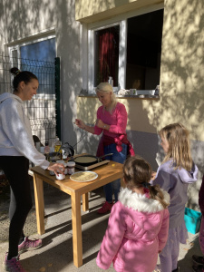 Palačinke prijaznosti – Otroci so sodelovali pri pripravi in delitvi palačink-izreči lepo besedo ali podati zahvalo. Ob mizi je dišalo po prijateljstvu in medsebojnem spoštovanju, ne le po palačinkah. Med čakanjem na sladke palačinke pa so otroci ustvarjali z naravnim materialom.