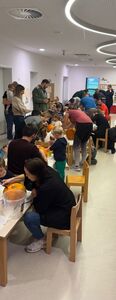 Mesec smo zaključili z jesenskim neformalnim srečanjem s starši, kjer smo skupaj preživeli prijetno popoldne. Starši so skupaj z otroki izrezovali strašljive in zabavne buče, ki zdaj krasijo vhod v naš vrtec. Dogodek smo zaključili z rajanjem na hodniku, kjer so se otroci, starši in strokovne delavke ob glasbi in smehu še dodatno povezali.