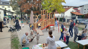 Ob prijetnem jesenskem soncu so otroci veselo raziskovali igrišče, starši pa so se ob klepetu družili.