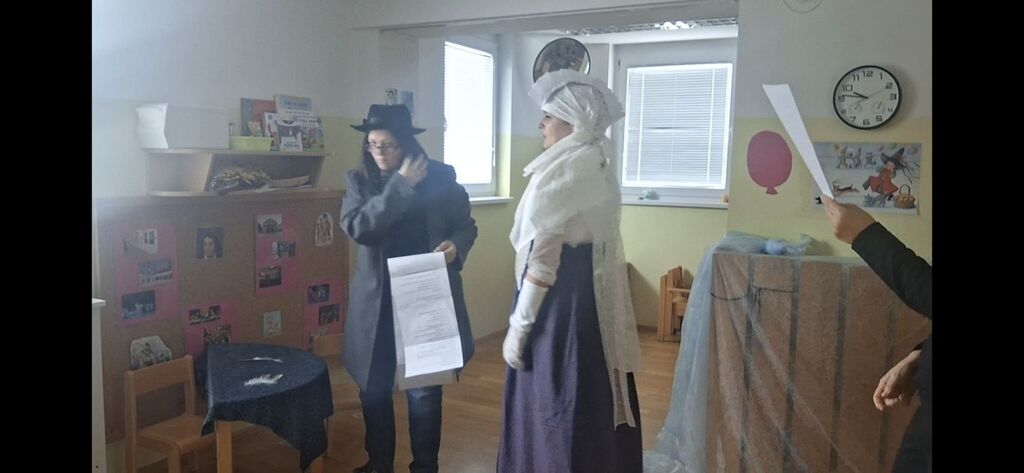 Otroci so si ogledali gledališko predstavo Povodni mož v izvedbi strokovnih delavk. Predstava je otrokom na zanimiv način predstavila Franceta Prešerna, Julijo ter vsebino pesnitve Povodni mož. Otroci so dogajanje spremljali z zanimanjem in pozornostjo. Po predstavi so otroci poizkusili Julijino obleko in Prešernov klobuk
