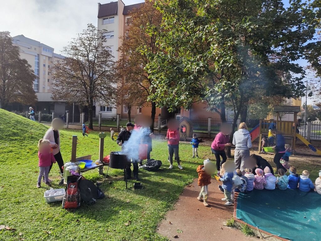 V tednu otroka smo toplo, sončno dopoldne izkoristili za peko kostanjev. Otroci so ga skupaj s starši nabrali, narezali in prinesli v vrtec. Vzgojiteljice in hišnik smo ga skrbno spekli, kuharice so nas pocrkljale z odličnim čajem. Ob spremljavi prijetne otroške glasbe smo tudi zaplesali.
