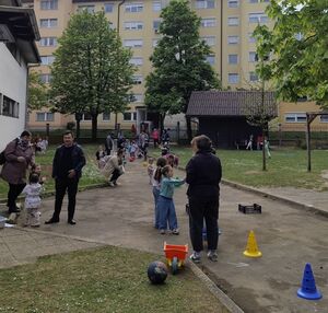 Otroci so v spremstvu staršev veselo zakorakali na igrišče kamor jih je privabila prijetna otroška glasba in naš Mojčin vrtiljak se je lahko začel.