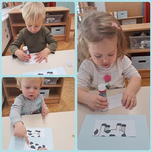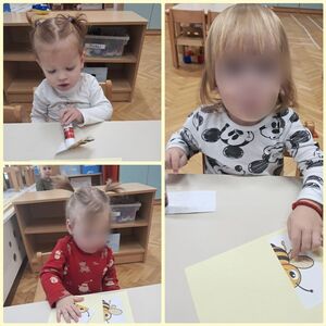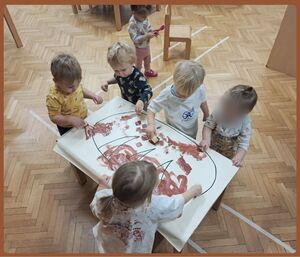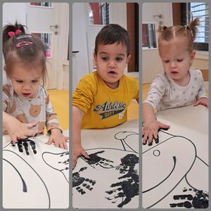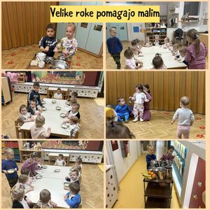 V tem mesecu pa se nismo samo likovno izražali, veliko smo peli in poslušali pesmice, rajali in plesali, spoznavali nove zgodbice in se družili z otroki starejših skupin, predvsem v času zajtrka in kosila so nas pogosto obiskali in nam priskočili na pomoč. Pomagali so pri pripravi in postrežbi obroka ter nam prijazno zaželeli dober tek.