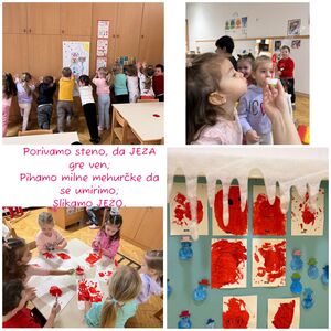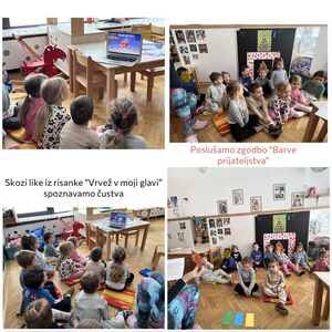 Poseben del januarja smo namenili tudi čustvom. S pomočjo iger, zgodb in pogovorov smo spoznavali, kako se počutimo in kako svoja čustva izrazimo na primeren način. Učili smo se poslušati drug drugega, povedati, kaj nas razveseli ali razžalosti, ter skupaj iskali rešitve ob nesoglasjih. Tako smo krepili prijateljstvo, medsebojno razumevanje in občutek varnosti v skupini.