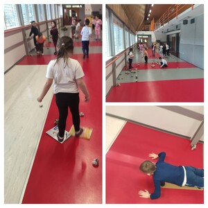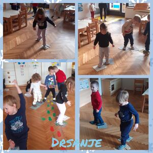 Snežne kepe smo metali v koš in odprtine v škatli ter tako razvijali spretnost ciljanja. Iz reklamnega papirja in krpic iz blaga smo ustvarili »zasnežene zaplate« in se preizkusili v »drsanju« po njih, pri čemer smo vadili ravnotežje.
