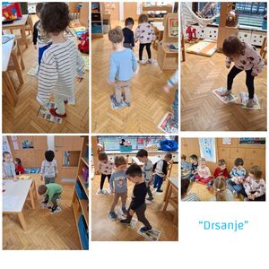 »Smučali« smo s smučmi, ki smo jih izdelali iz kartona in palicami za sestavo poligonov. Sestavili smo sestavljanko smučarja in bili ob tem pozorni na dele smučarske opreme – smučarska očala, čelada, pancarji, smuči, smučarske palice, kombinezon.
