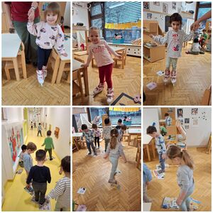 Iz papirnatih škatel smo izdelali »big footke« in se podali še na zabaven »tek na smučeh«. Skozi igro so otroci krepili gibanje, sodelovanje in ustvarjalnost ter spoznali, da se lahko v zimskih športih zabavamo tudi brez pravega snega.