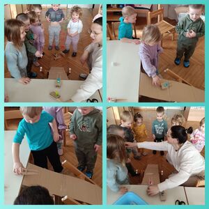 Za »sankanje« smo v jaslih izdelali manjše sani, nanje prilepili figurice iz kinder jajčkov ter jih igrivo in tekmovalno spuščali po kartonski progi. Navdušenja ni manjkalo!