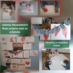 Na pravljični uri smo prisluhnili zgodbi Piščanček Pik in ustvarili verigo prijaznosti iz papirnatih obročkov z zapisanimi dobrimi dejanji. V igri Skrivni prijatelj so otroci drug drugemu podarjali nasmehe, risbice in drobne pozornosti.