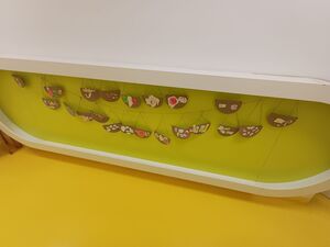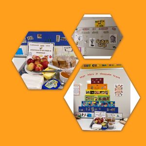 Vsaka skupina je pripravila svoj del prehranske piramide s slikicami slovenskih izdelkov ter z njimi okrasila hodnik našega vrtca. Na zajtrk smo povabili tudi upokojenke Kranjskih vrtcev, ki smo jih razveselili s prijetnim nastopom. Peli smo, plesali in se skupaj veselili.