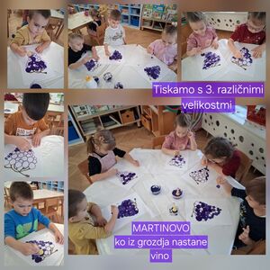 Ob Martinovanju smo se pogovarjali o trgatvi in nastanku vina. Otroci so z okroglimi gobicami odtiskovali grozdje ter ustvarili čudovite umetniške izdelke.