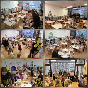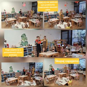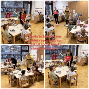V mesecu novembru smo v vrtcu Najdihojca obeležili Tradicionalni slovenski zajtrk, ki je letos potekal pod sloganom Moja izbira je slovenska hrana, ter Teden slovenske hrane. Dan pred tradicionalnim zajtrkom sta otroke obiskali »čebelica« in »jabolko«, jih motivirali ter spomnili, da nas naslednji dan čaka nekaj okusnega in slastnega. Skupaj smo deklamirali pesem Čebelice. V skupinah so otroci ustvarjali čebelice, rezali, lepili in sestavljali zanimive likovne izdelke.